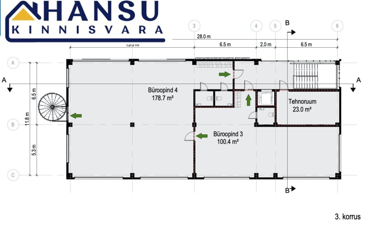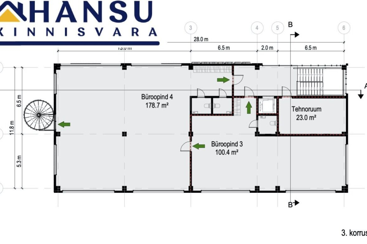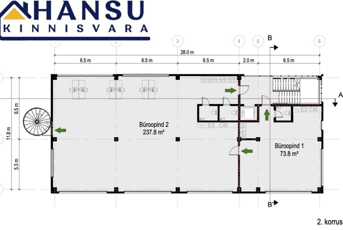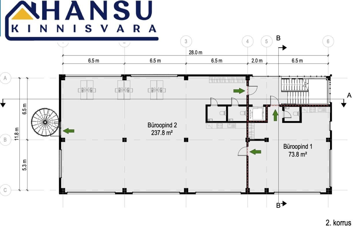 Büroopinnad suurusega 279,1 m2 + tehnoruum suurusega 23,0 m2.