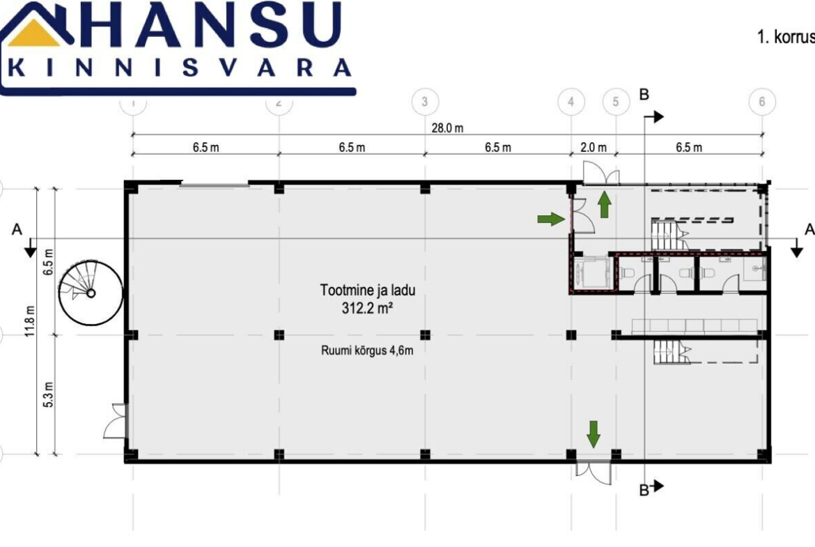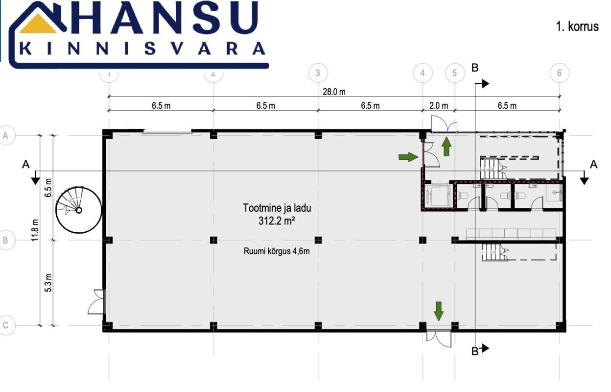 Planeeritud tootmise ja lao pinnad kõrge laega 4,6 m2, köetava pinnaga 312,2 m2.