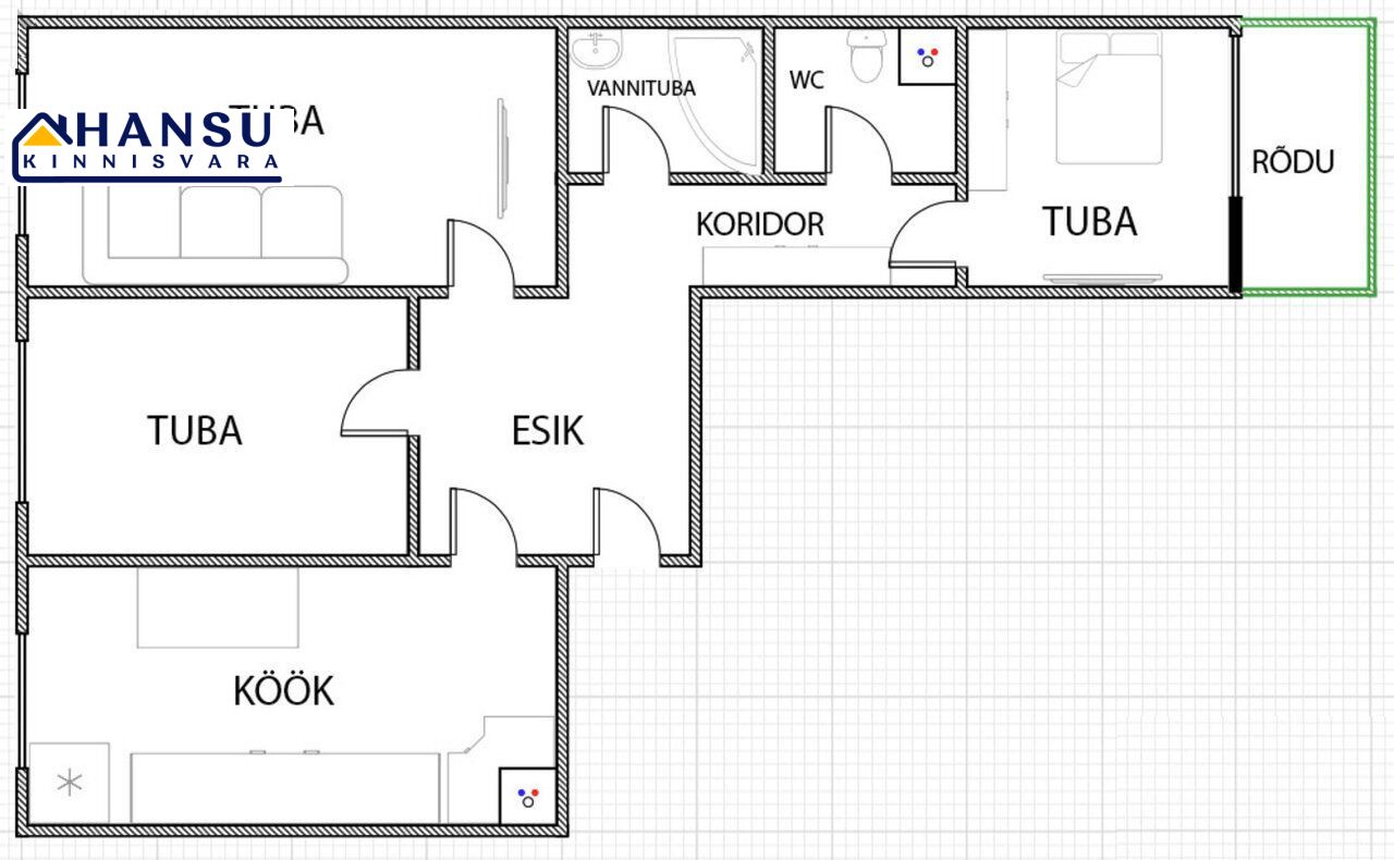 Toad on jaotud järgnevalt: Avar esik, köök, lastetuba, elutuba, väike koridor kapiga, avar vannituba ja eraldi WC, edasi minnes avaneb ilus magamistuba pääsega klaasitud rõdule.