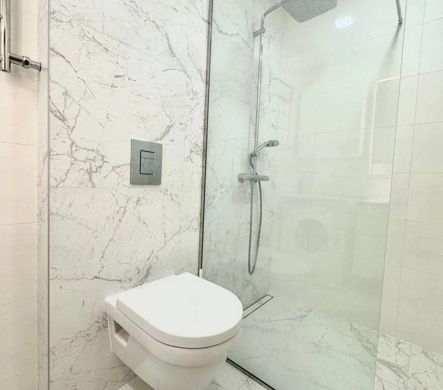 Vannitoas Balteco valamukapp, pesumasin, seinasisese raamiga wc-pott ja Grohe vihmadušš.