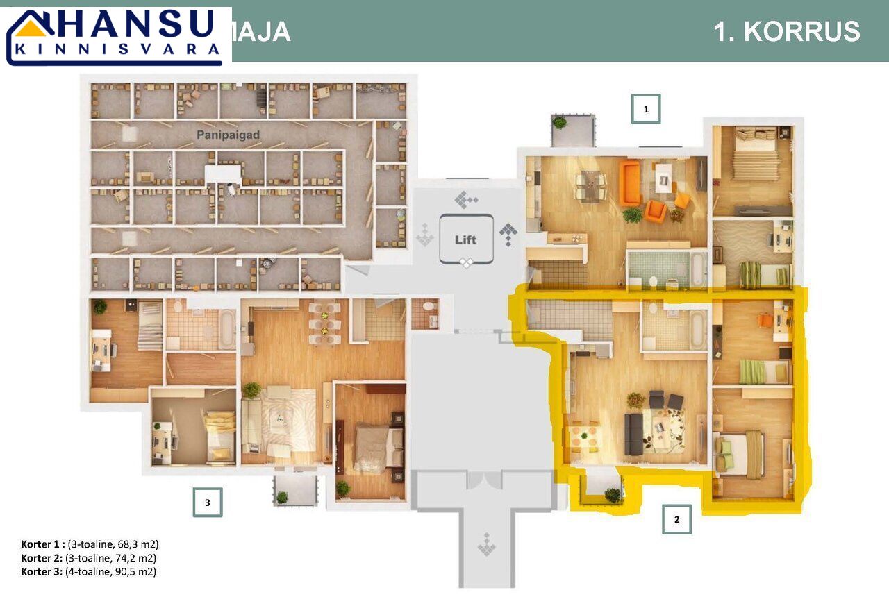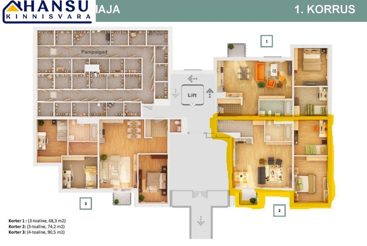 Korteriga kaasneb isiklik parkimiskoht maa-aluses garaažis ning köetav panipaik.